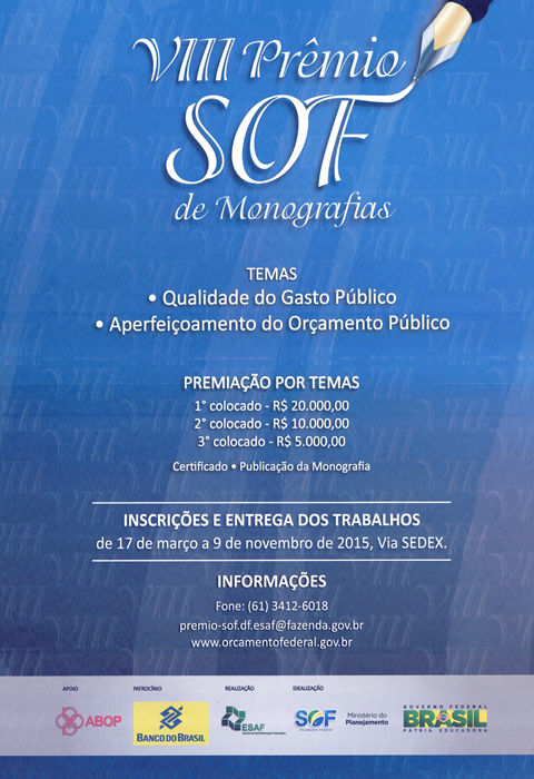 O VIII Prêmio SOF de Monografias irá premiar as melhores monografias com os temas “Qualidade do Gasto Público” e “Aperfeiçoamento do Orçamento Público”. As inscrições estão abertas até 9 de novembro de 2015.