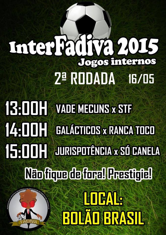 A Atlet Fadiva convida os alunos, professores e colaboradores da Faculdade de Direito de Varginha para participarem sábado, dia 16 de maio, da 2ª etapa do Interfadiva 2015. Os jogos acontecerão no Bolão Brasil, às 13h. Não fiquem de fora, levem seus amigos, torçam e comemorem com as equipes e membros da Atlética!