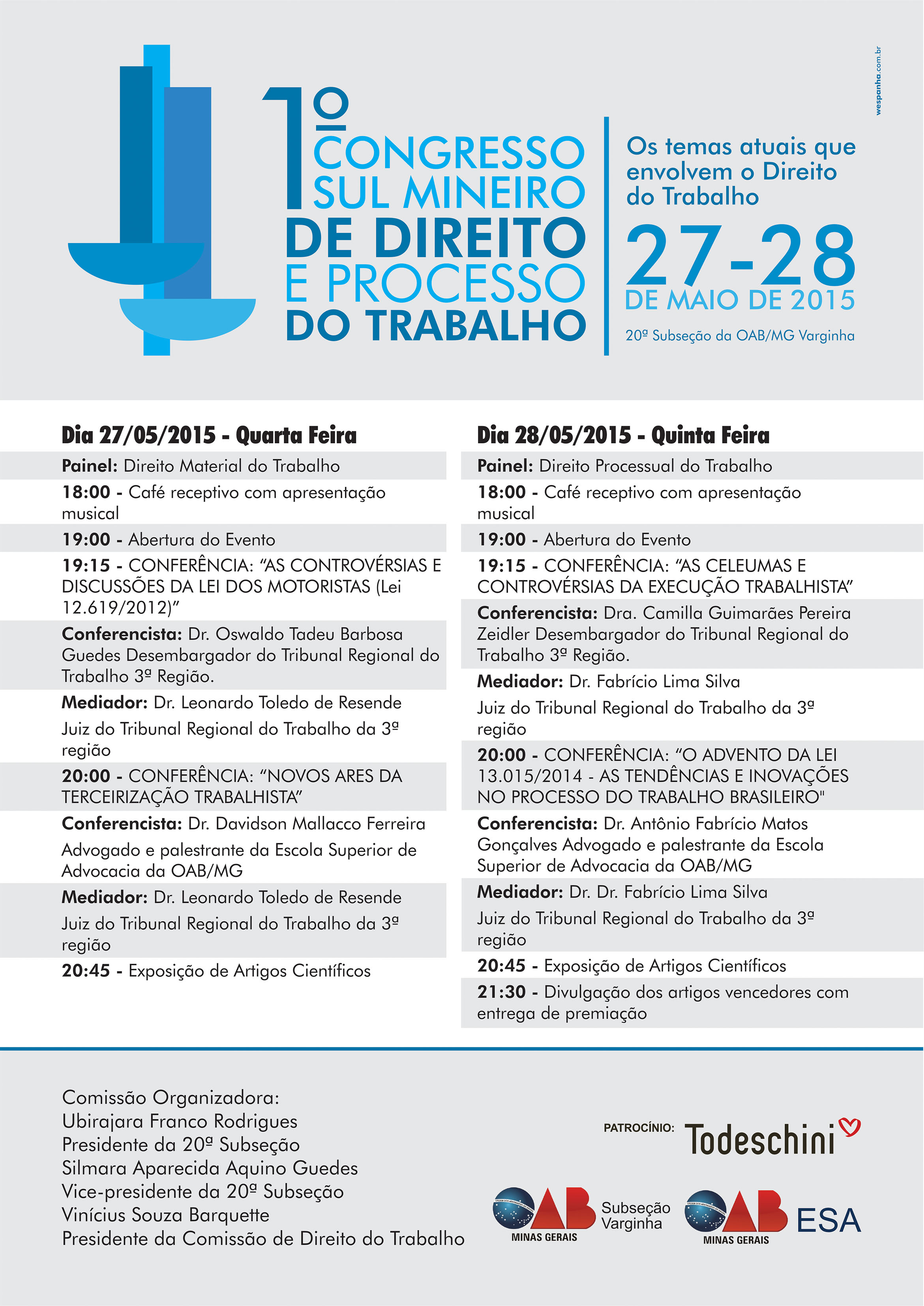 Acontecerá hoje e amanhã o 1º Congresso Sul Mineiro de Direito e Processo do Trabalho, na OAB de Varginha. Fiquem por dentro da programação e participem!