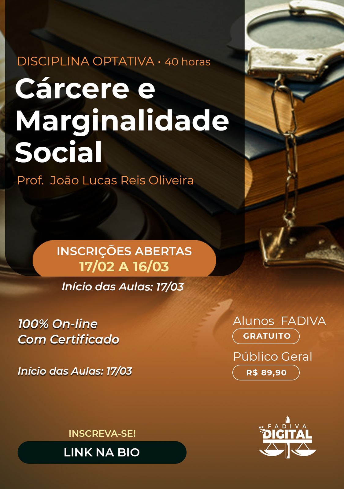 A disciplina optativa “Cárcere e Marginalidade Social”, ministrada pelo Prof. João Lucas Reis Oliveira, está com inscrições abertas! 📚💻