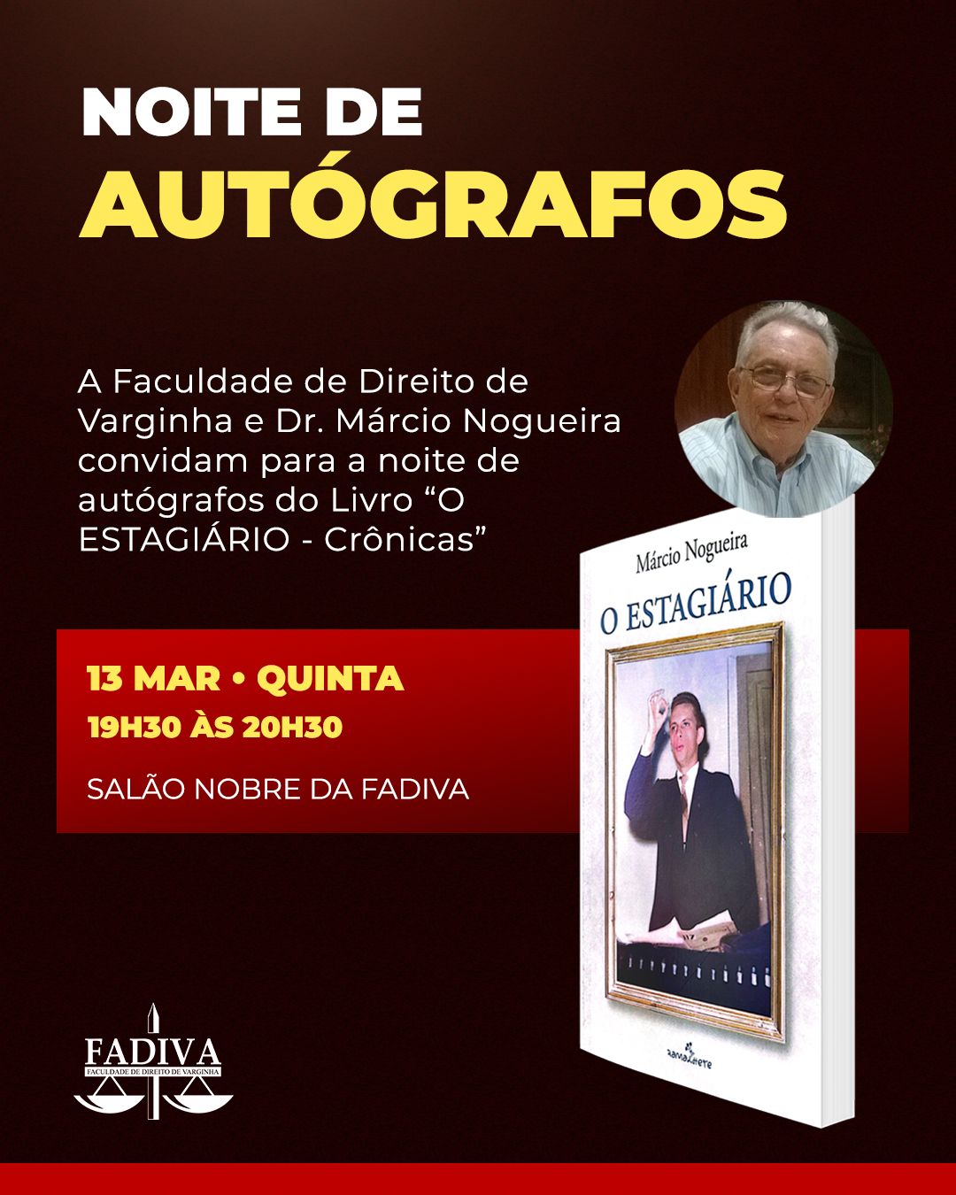 Em comemoração aos 59 anos da FADIVA, convidamos você para um momento especial! O professor e escritor Dr. Márcio Nogueira estará conosco para uma noite de autógrafos do livro “O Estagiário – Crônicas”.