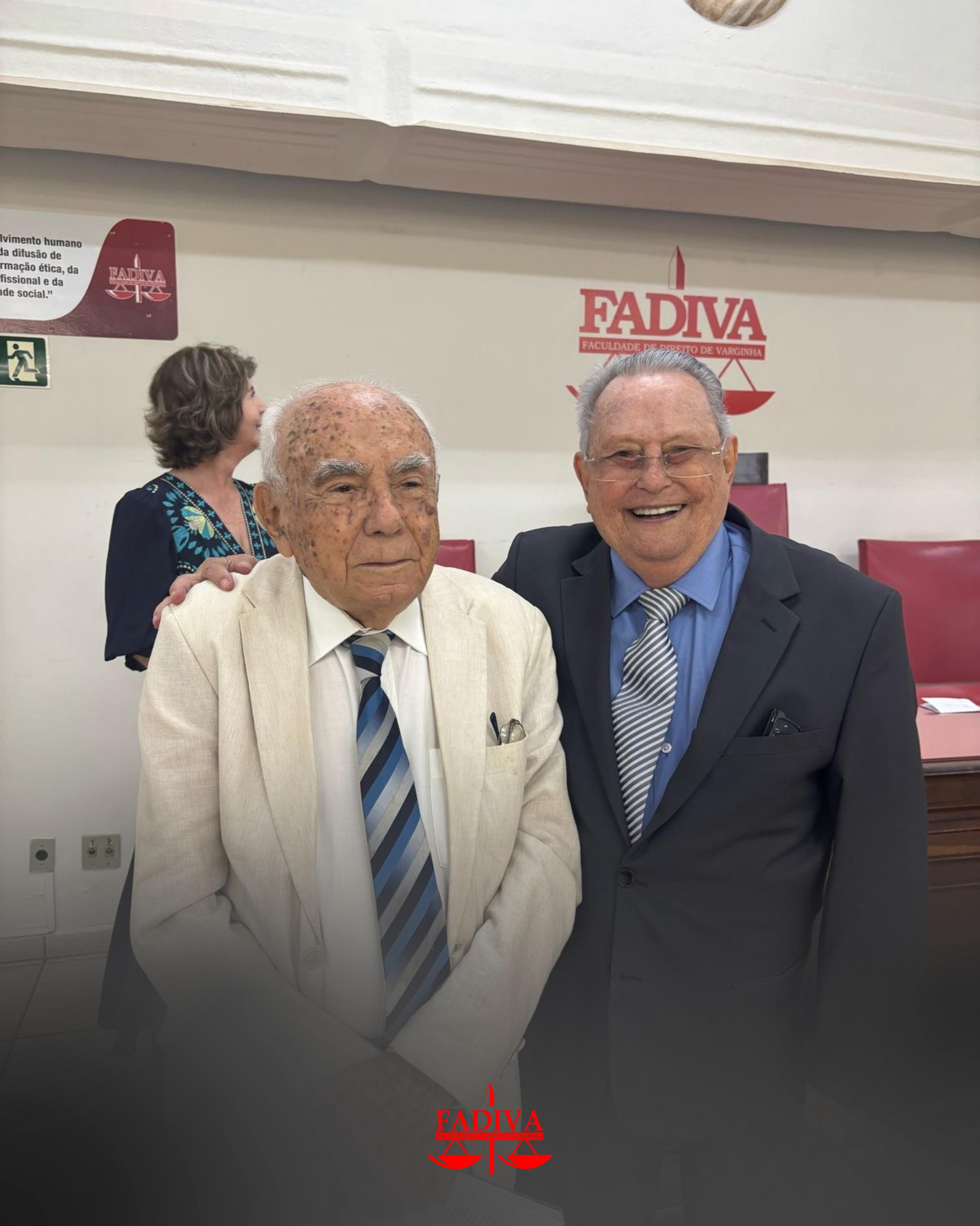 O Dr. Morvan Acayaba, coordenador do Núcleo de Prática Jurídica e fundador da FADIVA, deu as boas-vindas ao ilustre professor Márcio Nogueira, relembrou sua trajetória na instituição e destacou que ambos são os mais antigos da casa.