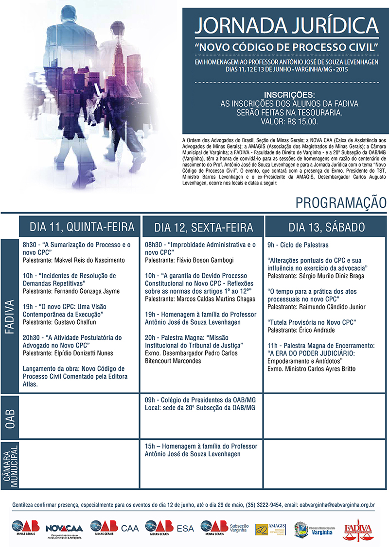 O prazo para inscrições da Jornada Jurídica – Novo Código de Processo Civil foi prorrogado! Alunos da Faculdade de Direito de Varginha podem efetuar a inscrição até o dia 09 de junho, na tesouraria e, assim, participar desse grande evento que acontecerá nos dias 11, 12 e 13 de junho, no Salão Nobre.