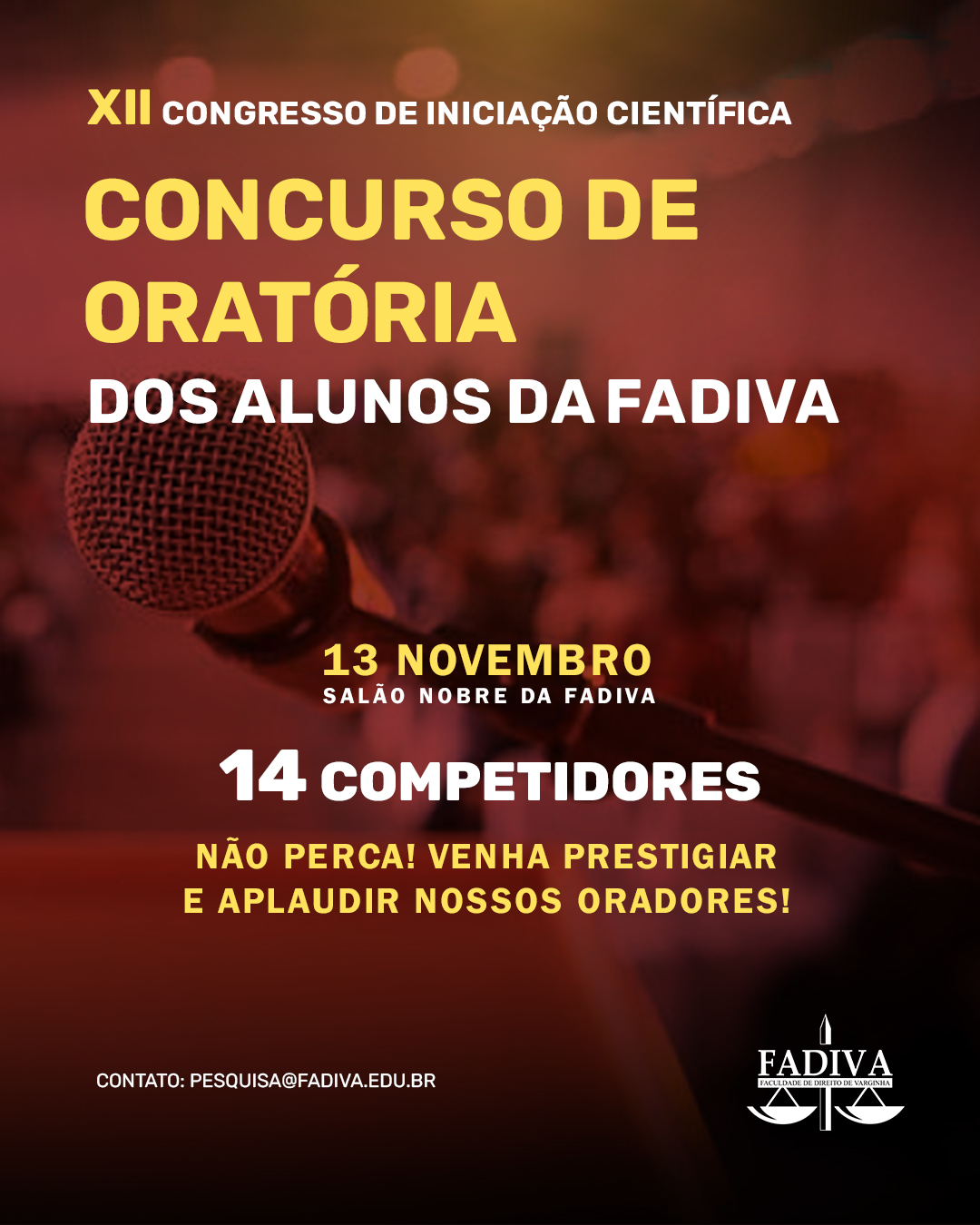 Será dia 13 de novembro, no Salão Nobre da FADIVA, contando com 14 competidores prontos para inspirar, emocionar e mostrar o poder da boa comunicação!