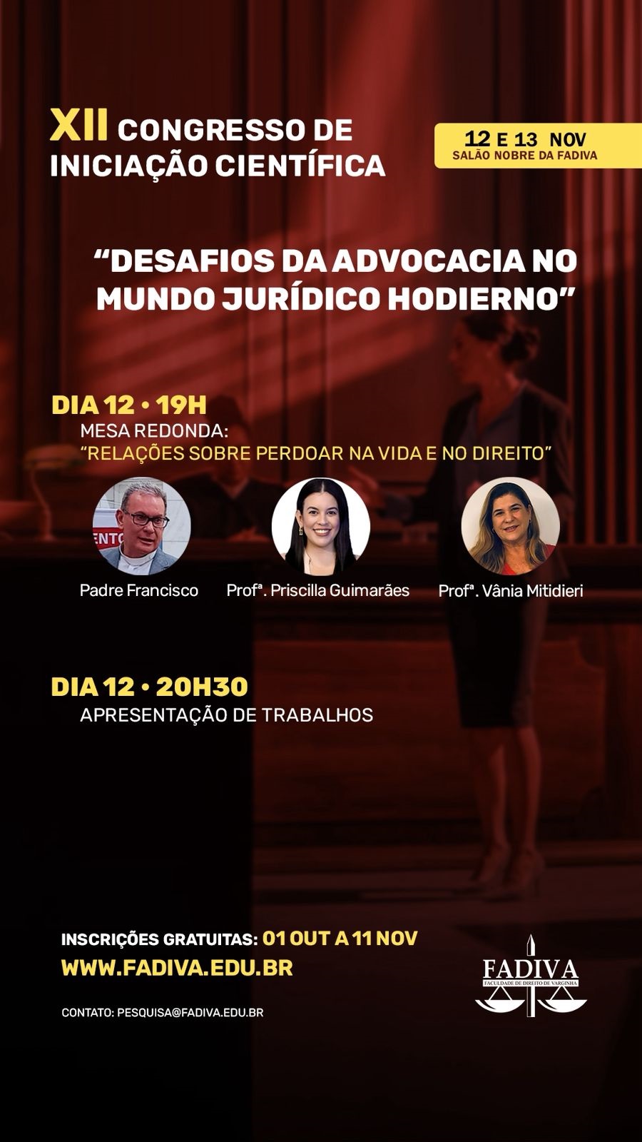 Mesa-redonda com Padre Francisco(@assiscof), Prof.ª Priscilla Guimarães (@priguimaraes.adv) e Prof.ª Vânia Mitidieri (@vmmitidieri), debatendo o tema “Relações sobre perdoar na vida e no Direito”.
