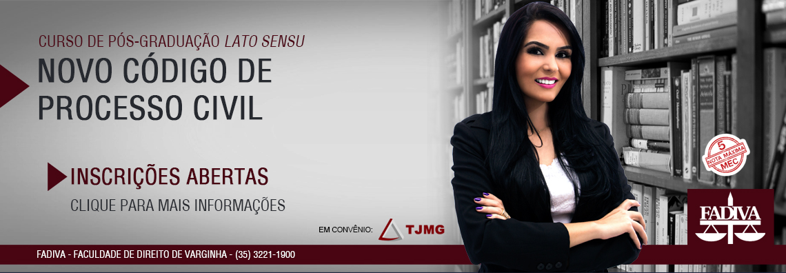 Através de um convênio** com o Tribunal de Justiça de Minas Gerais - TJMG e com a Escola Judicial Edésio Fernandes -EJEF, que garante aos servidores do TJMG descontos exclusivos nas mensalidades, a FADIVA ministra cursos de Especialização, na modalidade presencial, com duração de 18 meses letivos.