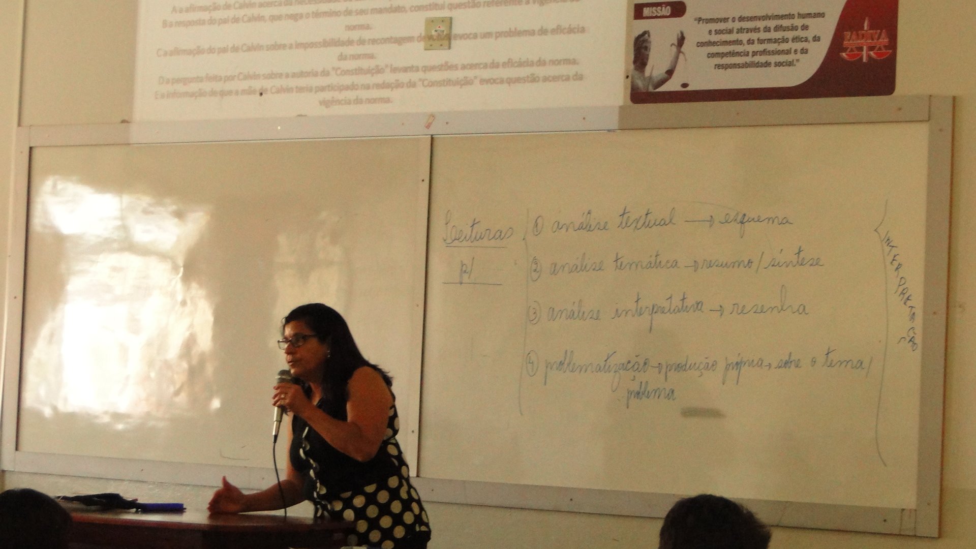 Neste momento, os alunos do 5º ano Diurno estão em sala com a professora Rosângela Maria Couto, convidada especialmente para ministrar aulas de Linguística para os alunos convocados para o ENADE/2015.