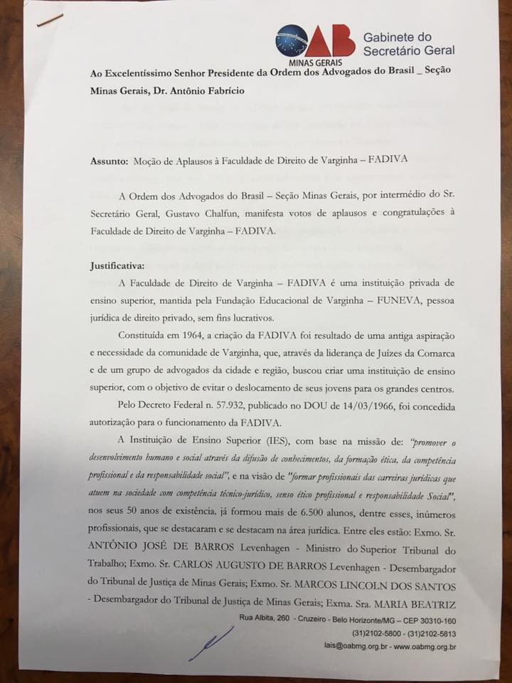 A Ordem dos Advogados do Brasil - OAB, através do pedido de seu Secretário Geral, Dr. Gustavo Chalfun, prestou homenagens à Faculdade de Direito de Varginha - FADIVA e, por unanimidade, concedeu à instituição Moção de Aplausos pelos seus 50 anos.