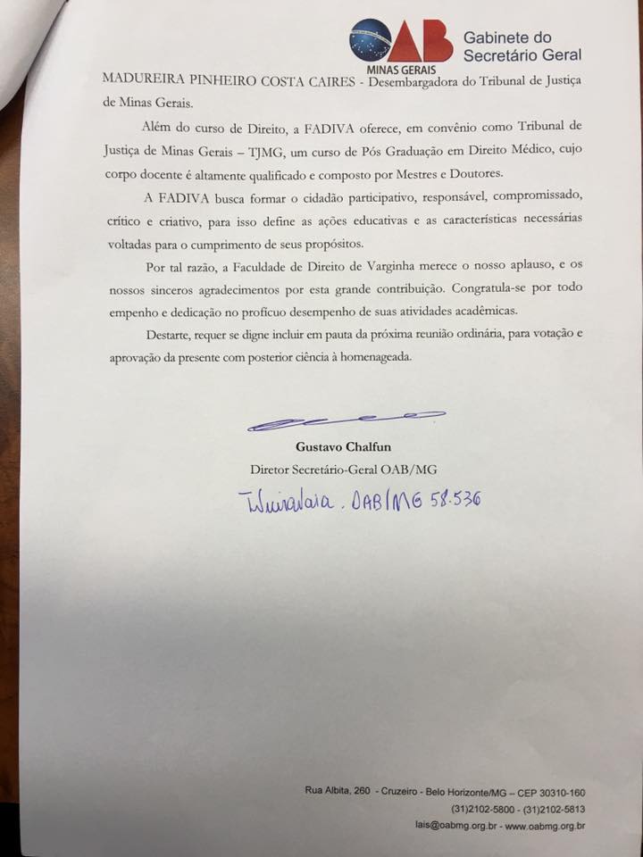 A Faculdade de Direito de Varginha e, sua mantenedora, a Fundação Educacional de Varginha, agradecem a OAB e, principalmente, ao Dr.Gustavo Chalfun por referida homenagem e reconhecimento.
