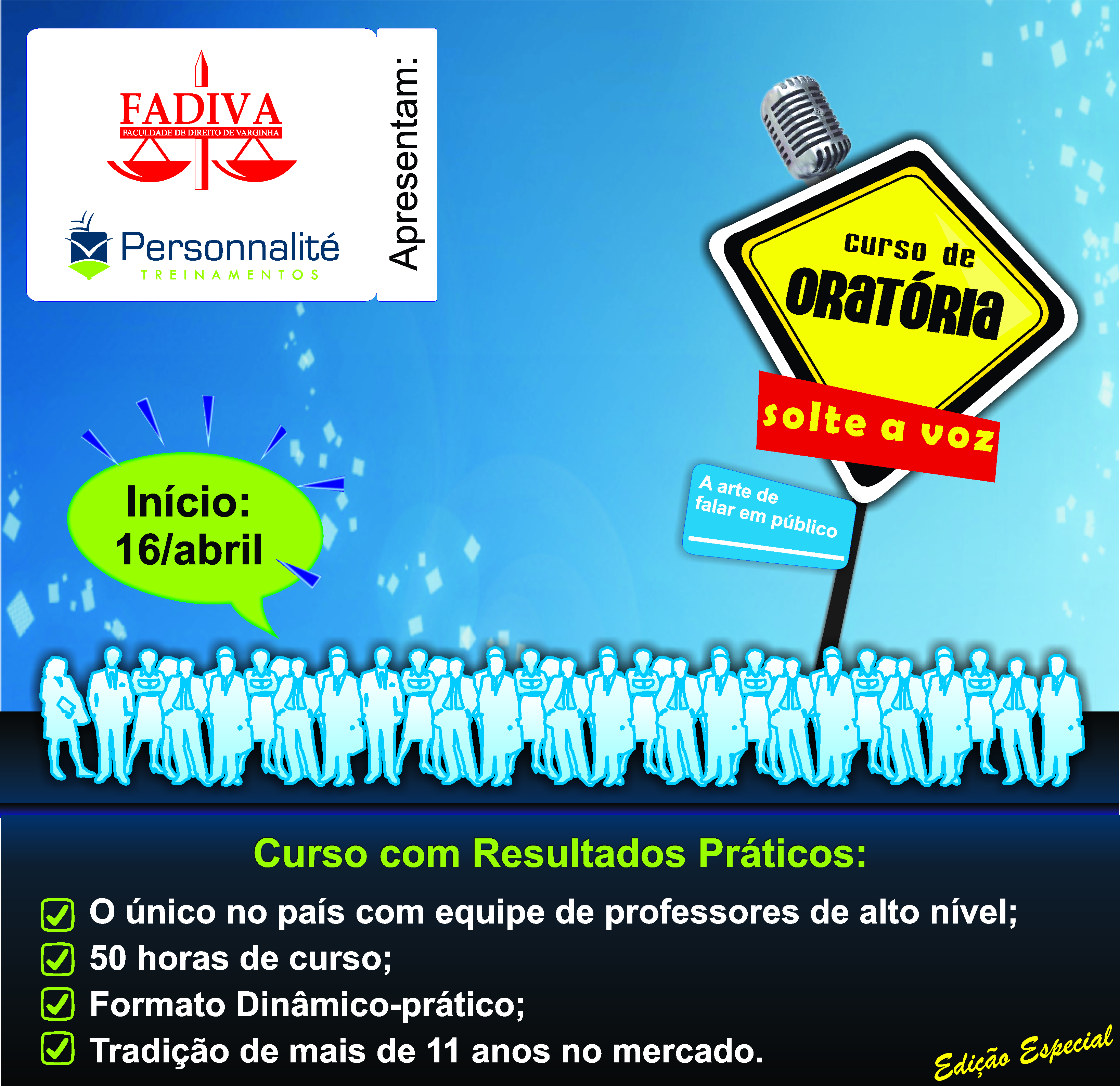 A Personnalité Treinamentos em parceria com a Fadiva realizará o curso de comunicação: ORATÓRIA - A ARTE DE FALAR EM PÚBLICO. Reconhecida pelos resultados e a melhoria no nível de comunicação de seus alunos, é a única no país que conta com uma equipe multidisciplinar de professores, todos com experiência em suas respectivas áreas. Dentre eles, contamos com a participação, exclusiva, de jornalistas com experiência nos maiores veículos de comunicação, como a Rede GLOBO de Televisão.