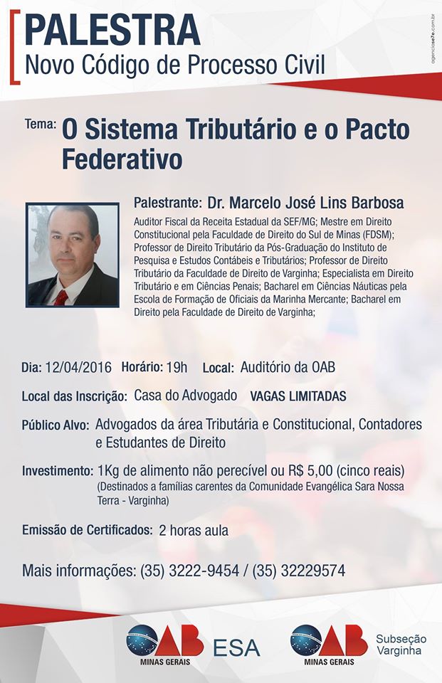 Dia 12/04: O Sistema Tributário e o Pacto Federativo, com o professor de Direito Tributário da FADIVA, Dr. Marcelo José Lins Barbosa.