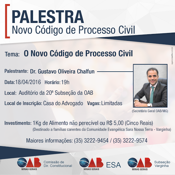 Dia 18/04: O Novo Código de Processo Civil, com o professor de Direito Processual Civil da FADIVA, Dr. Gustavo de Oliveira Chalfun.