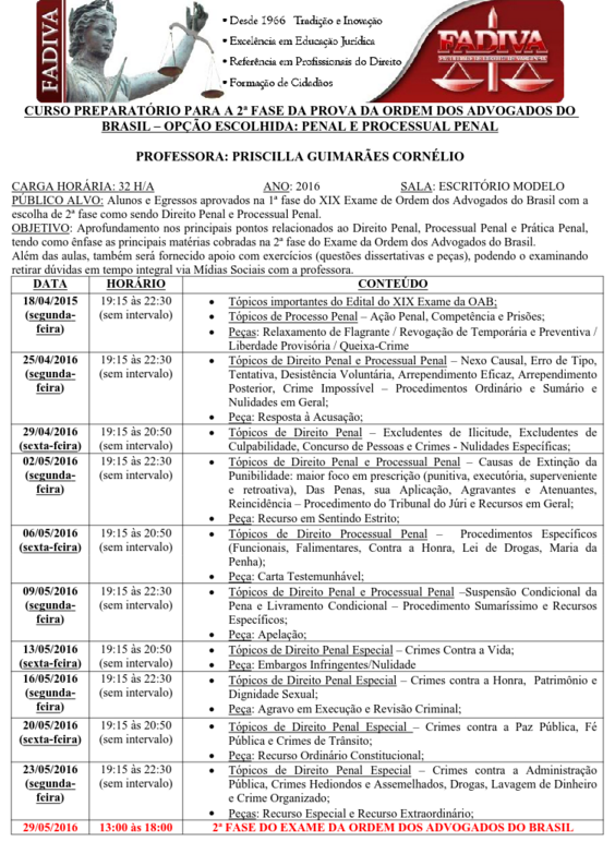 A Faculdade de Direito de Varginha e sua mantenedora, a Fundação Educacional de Varginha, informam que hoje terá início ao curso preparatório para a 2ª fase do Exame da OAB (opção Penal).