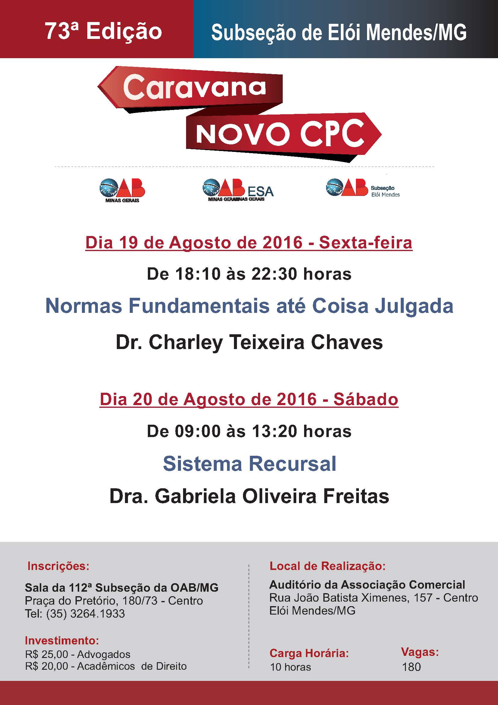 A Caravana da OAB/MG, que ministra atividades sobre o Novo Código de Processo Civil, estará em Elói Mendes nos dias 19 e 20.
