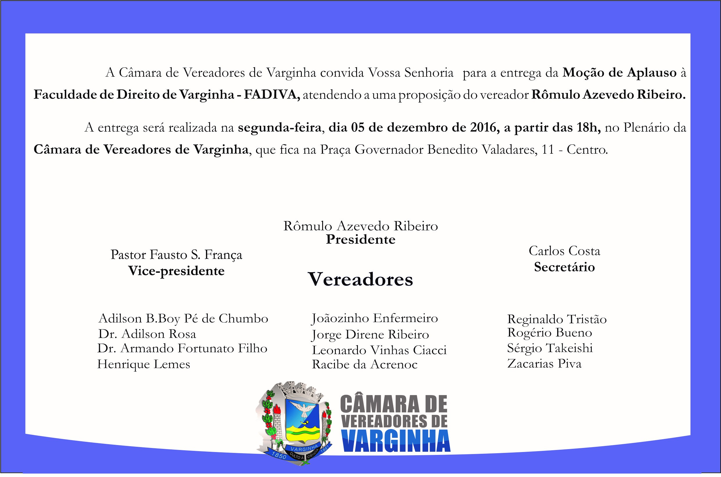 A Faculdade de Direito de Varginha - FADIVA, na próxima segunda, dia 05/12/2016, receberá uma Moção de Aplauso da Câmara de Vereadores de Varginha, sob a proposição do ilustre Dr. Rômulo Azevedo Ribeiro.