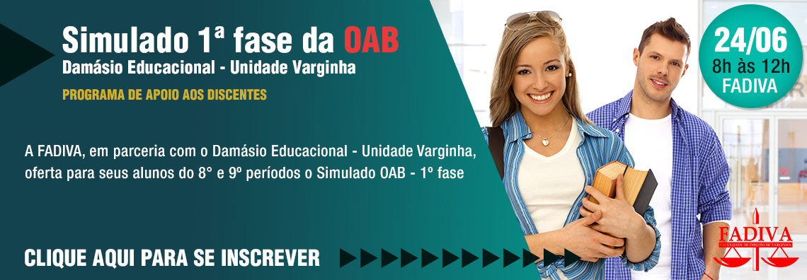 FADIVA, em parceria com Damásio – Unidade Varginha, disponibiliza para os alunos do 8º e 9º períodos o Simulado gratuito da 1ª fase da OAB que será realizado dia 24.06.17 (sábado). O horário será das 08:00 às 12:00 horas na Instituição. Uma oportunidade única para os alunos treinarem seus conhecimentos.