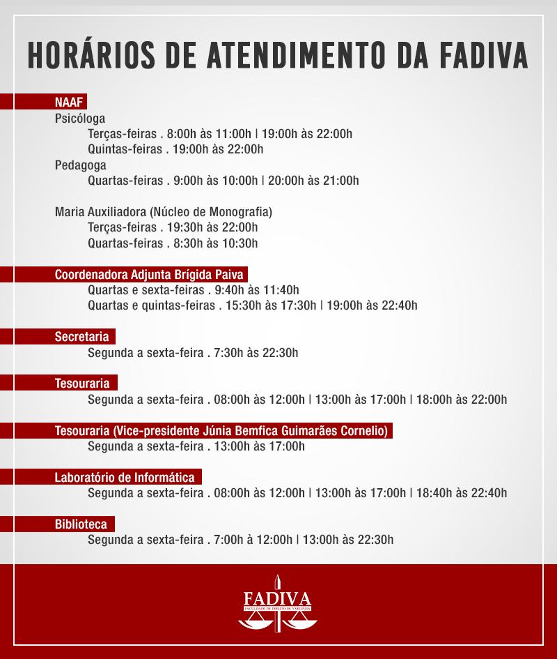 10/08/17 - ***HORÁRIO ATENDIMENTO NOS SETORES DA FACULDADE DE DIREITO DE VARGINHA - FADIVA***