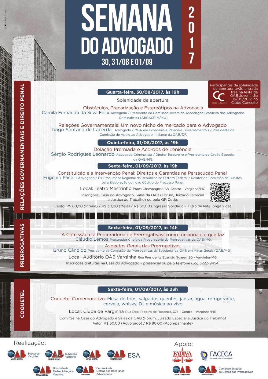Entre os dias 30 e 01/09, será realizada na Ordem dos Advogados do Brasil - Subseção de Varginha - a Semana do Advogado, a qual trará renomados palestrantes.
