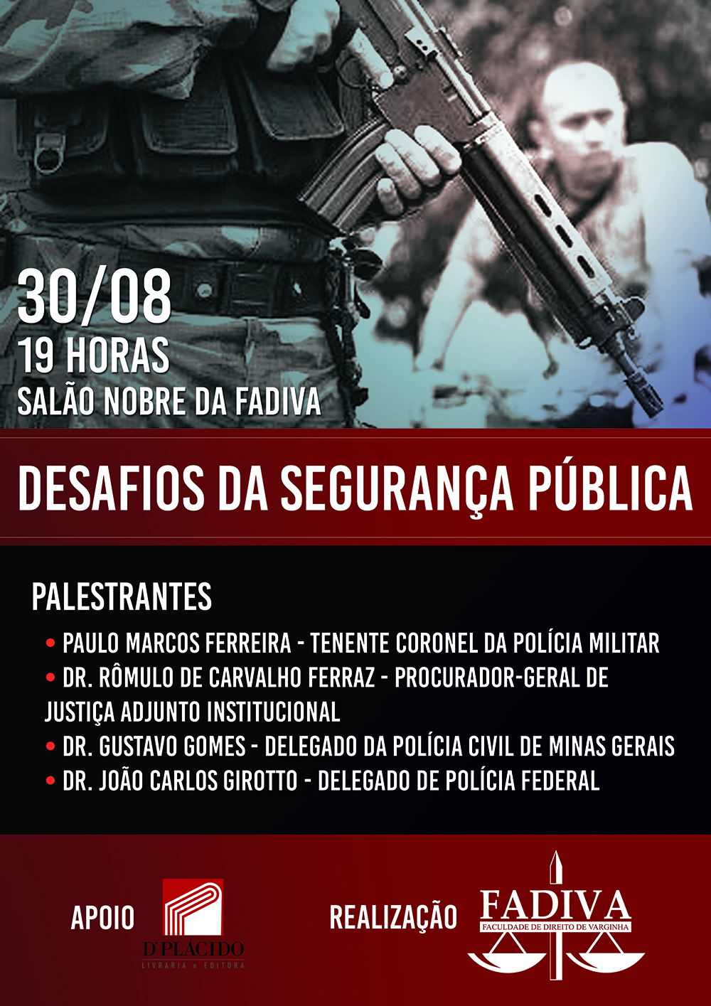 Na próxima quarta-feira, dia 30 de agosto, às 19h, no Salão Nobre da Faculdade de Direito de Varginha - FADIVA, acontecerá a importante palestra "Desafios da Segurança Pública".