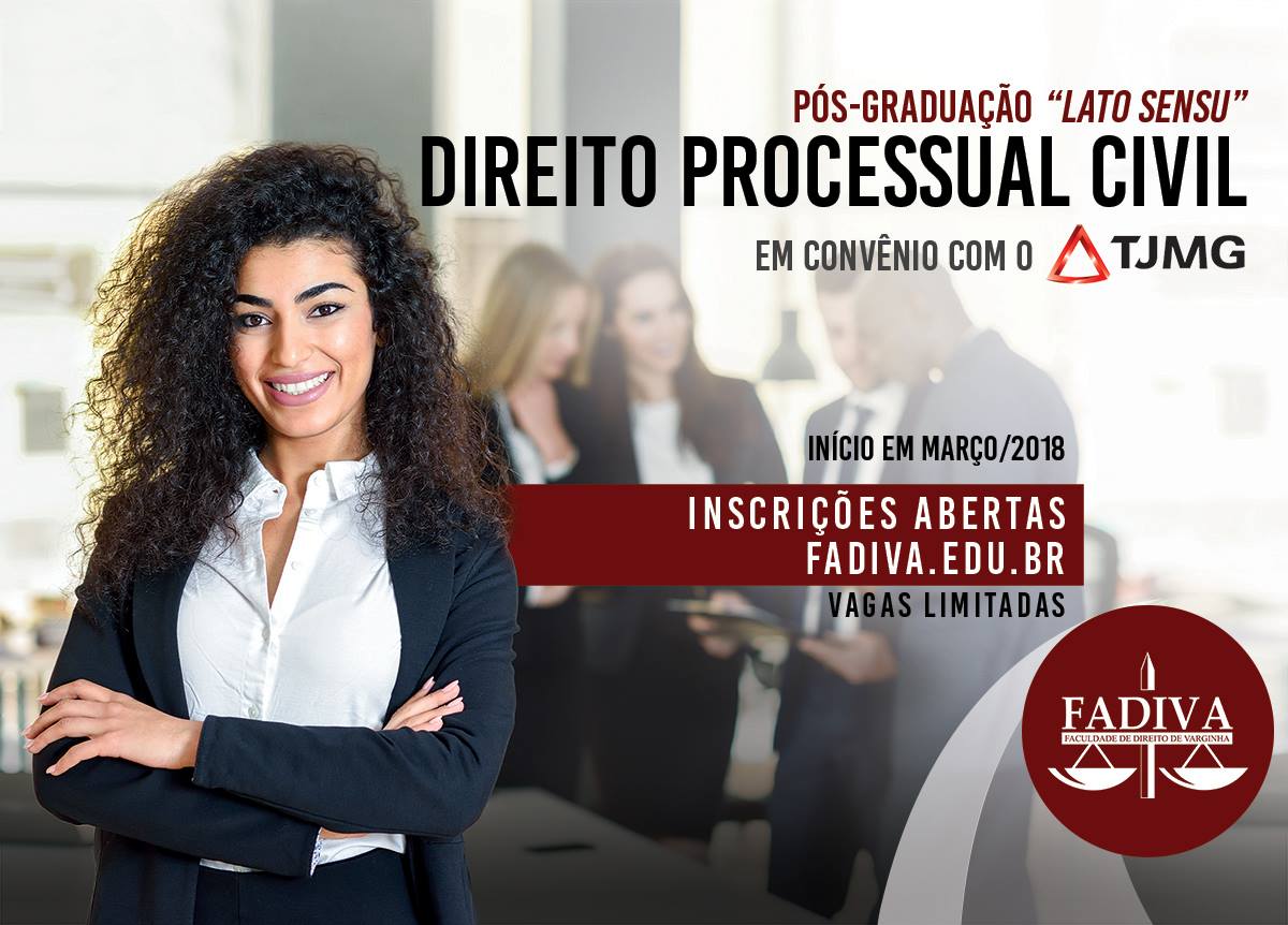 Pelo segundo ano consecutivo a Pós-graduação da FADIVA lança o seu curso de especialização em Direito Processual Civil. Quer-se com a presente especialização proporcionar ao profissional uma abordagem contextualizada e atualizada das implicações do Novo CPC na esfera prático-jurídica dos principais Tribunais do país.